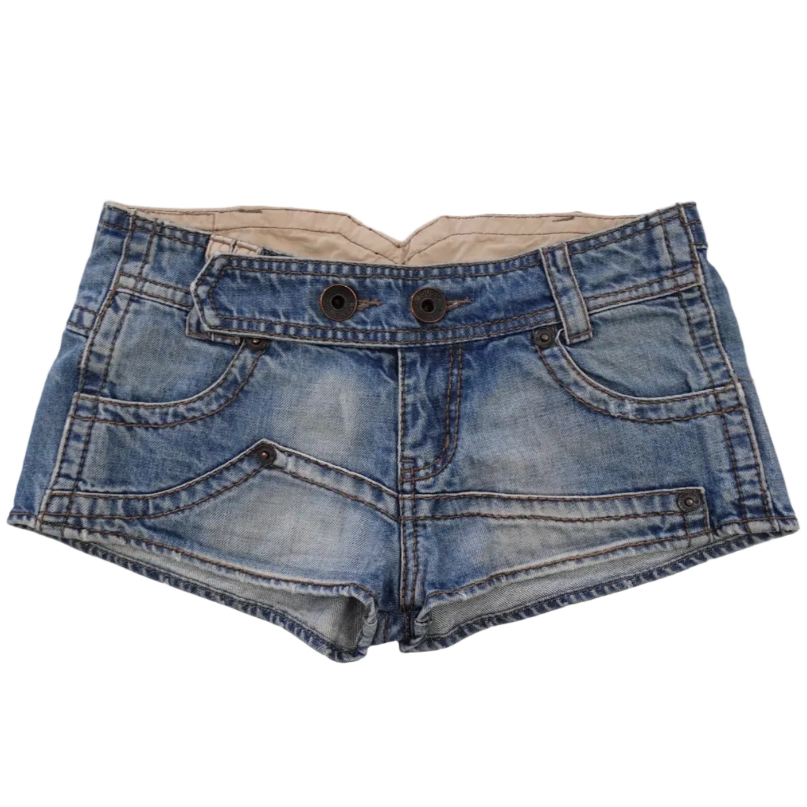 Japanese brand micro denim shorts with a V-cut back and low-rise front. These sit low and tiny, exactly how they’re supposed to.