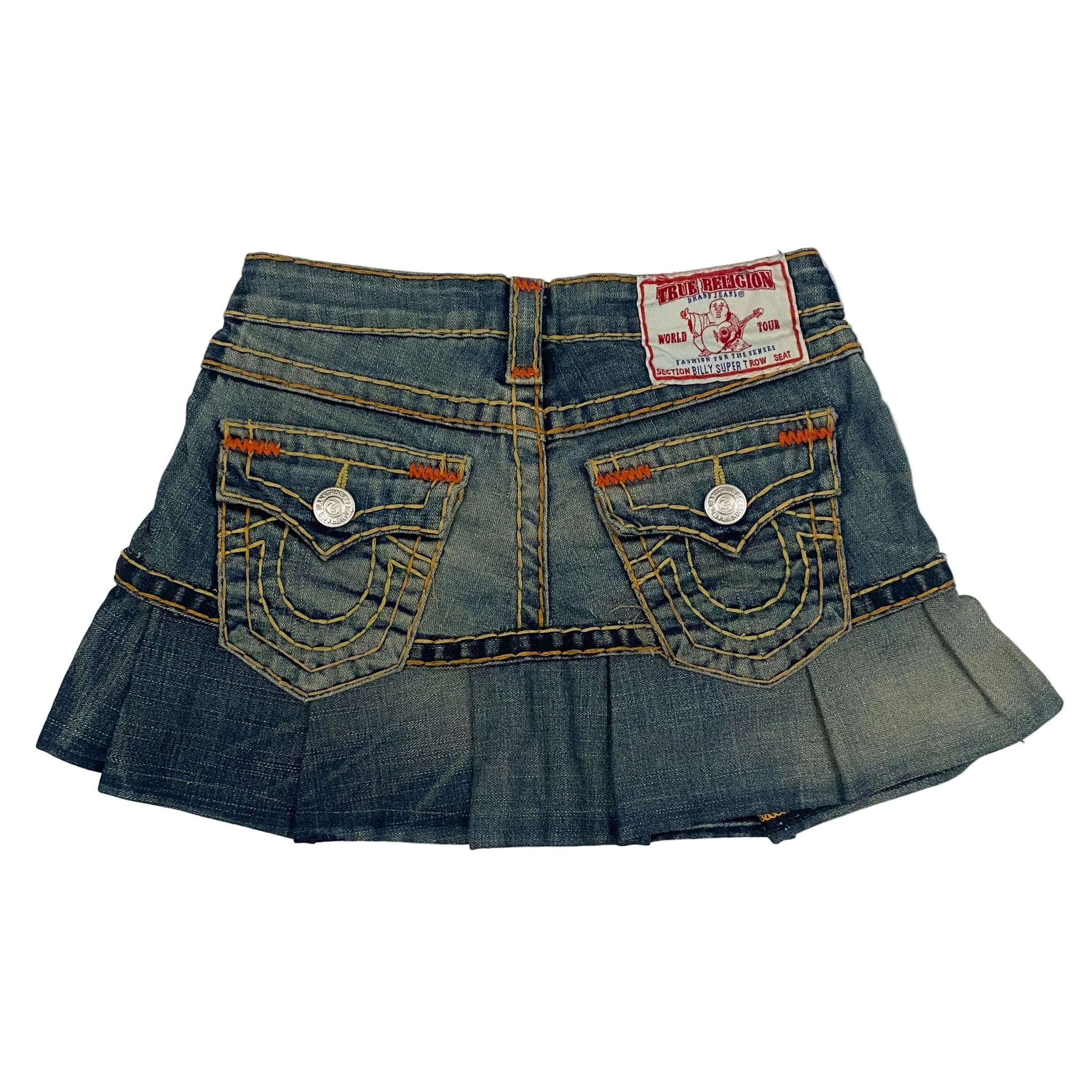 2000s reworked true religion custom pleated denim mini skirt - classic stitching