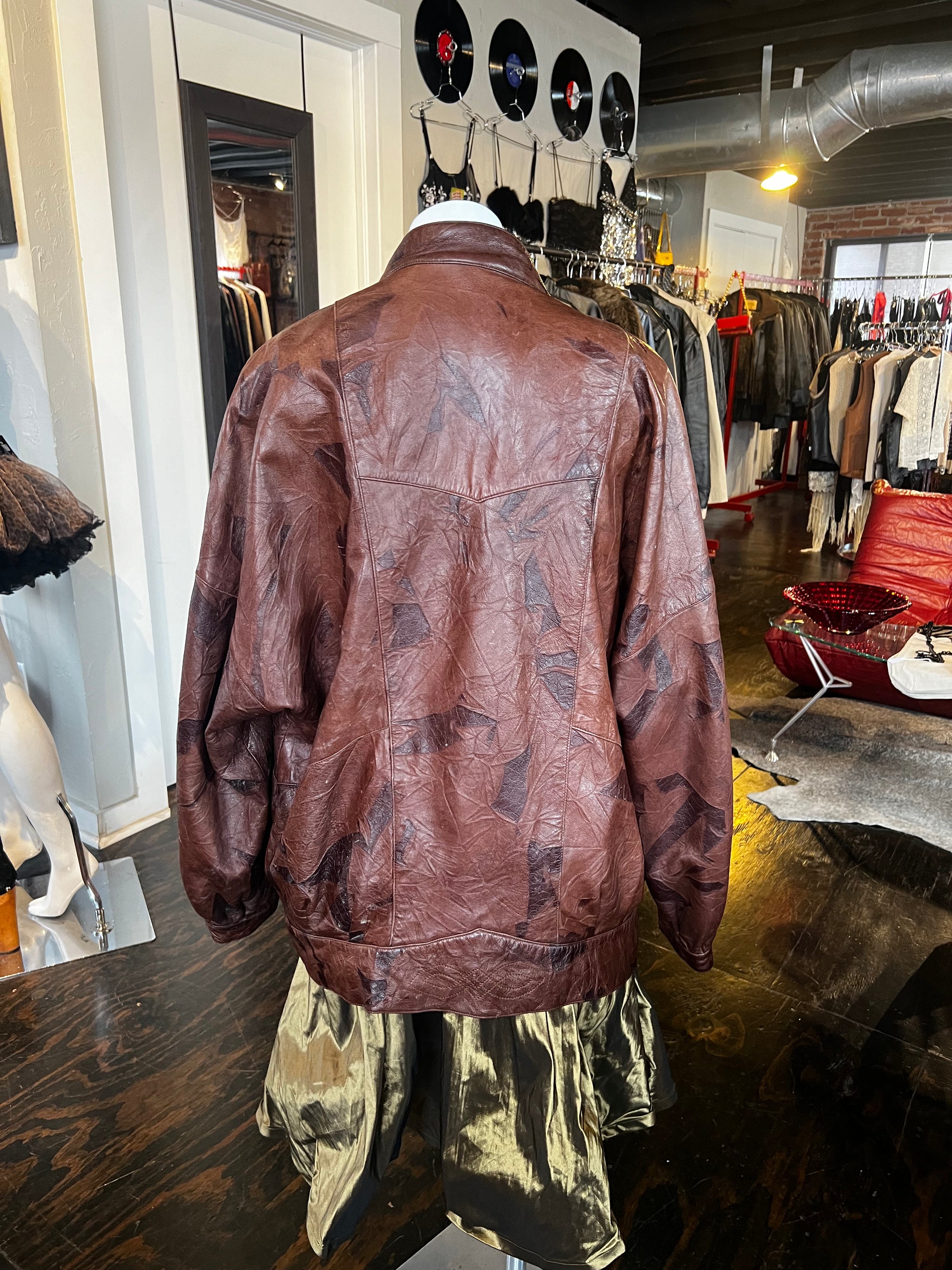 Two-tone reddish brown and dark brown leather oversized jacket with large pockets and button closures. Made in Spain. Note: few small scuffs.
