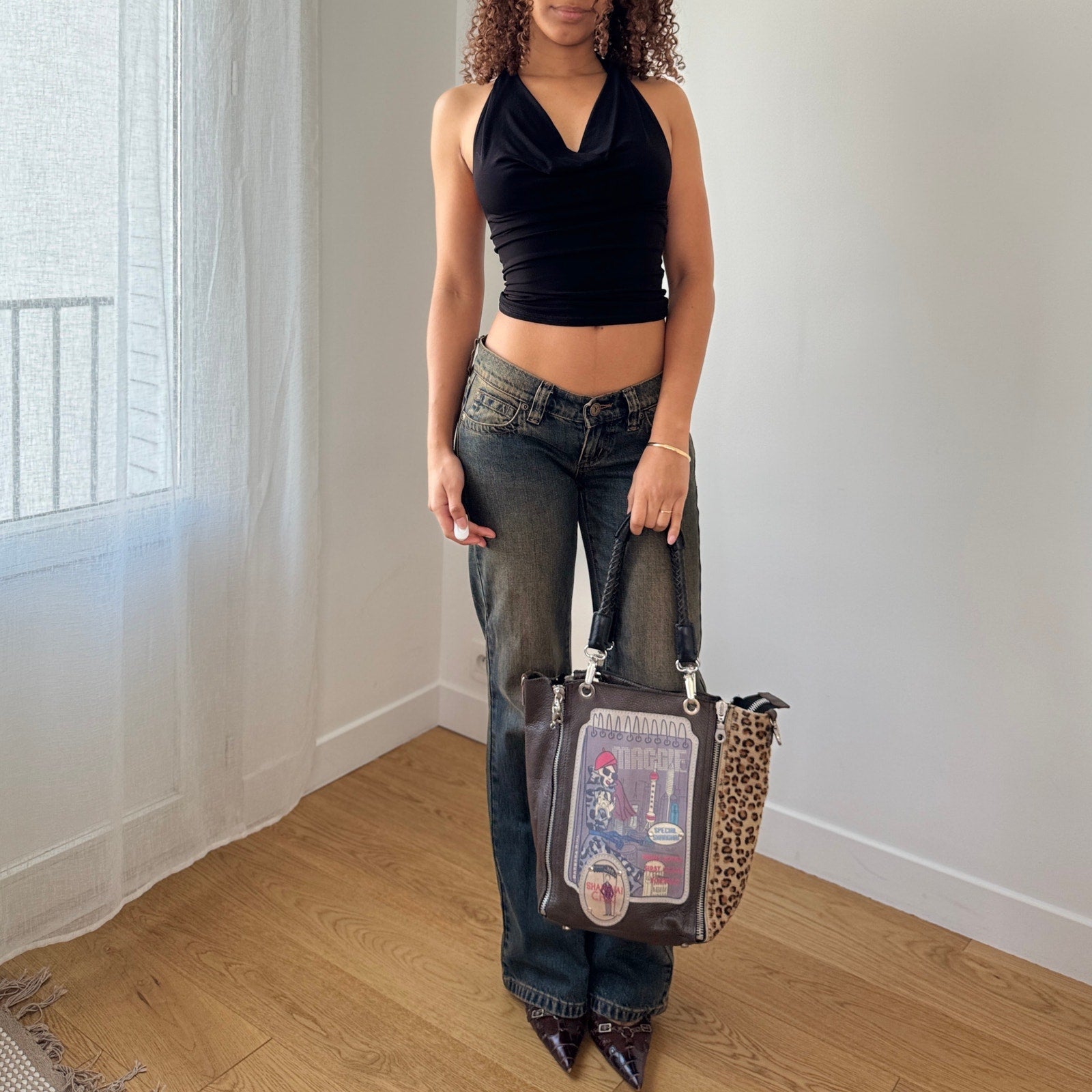 - Mixed panel design with illustrated front graphic, leopard print side panel, and zip pocket detailing