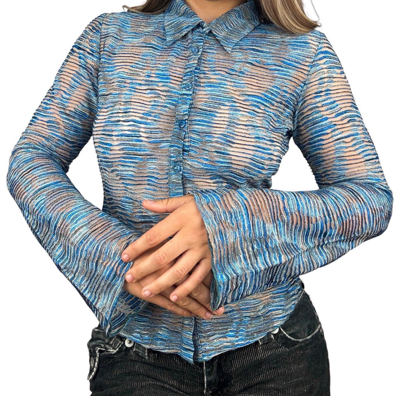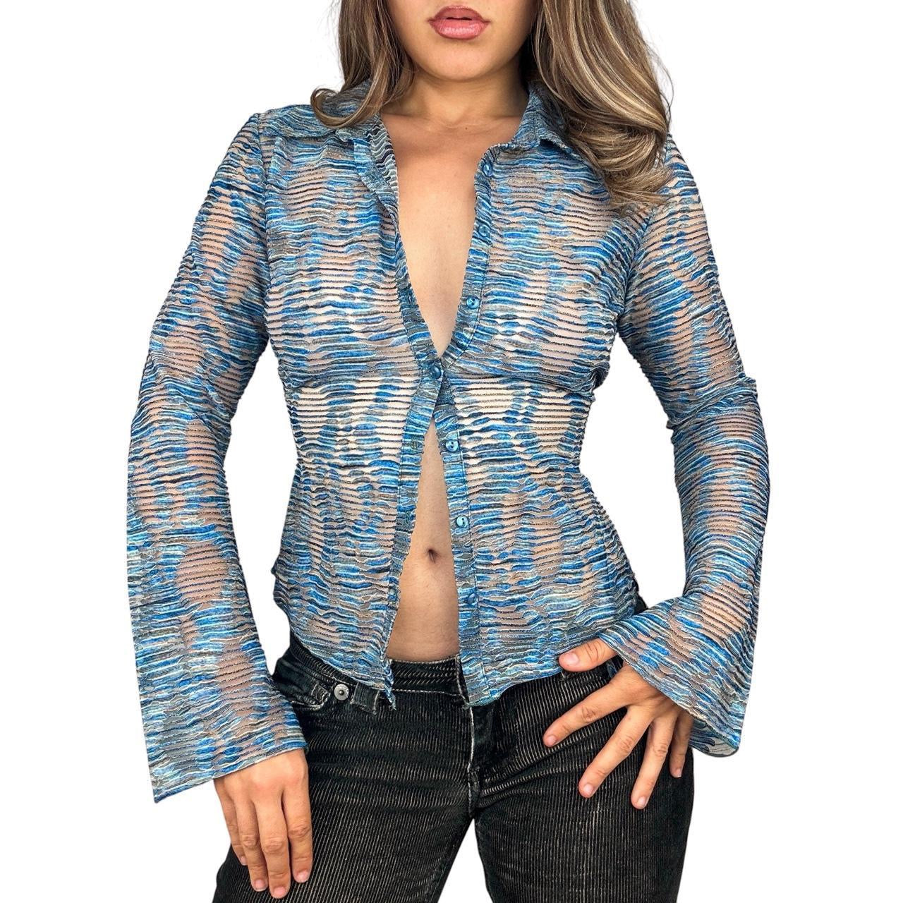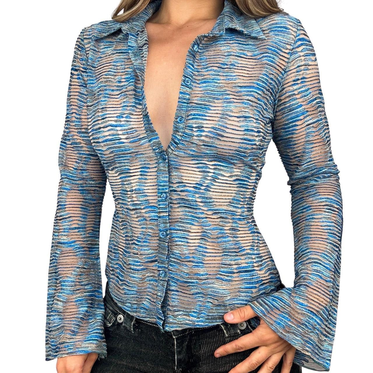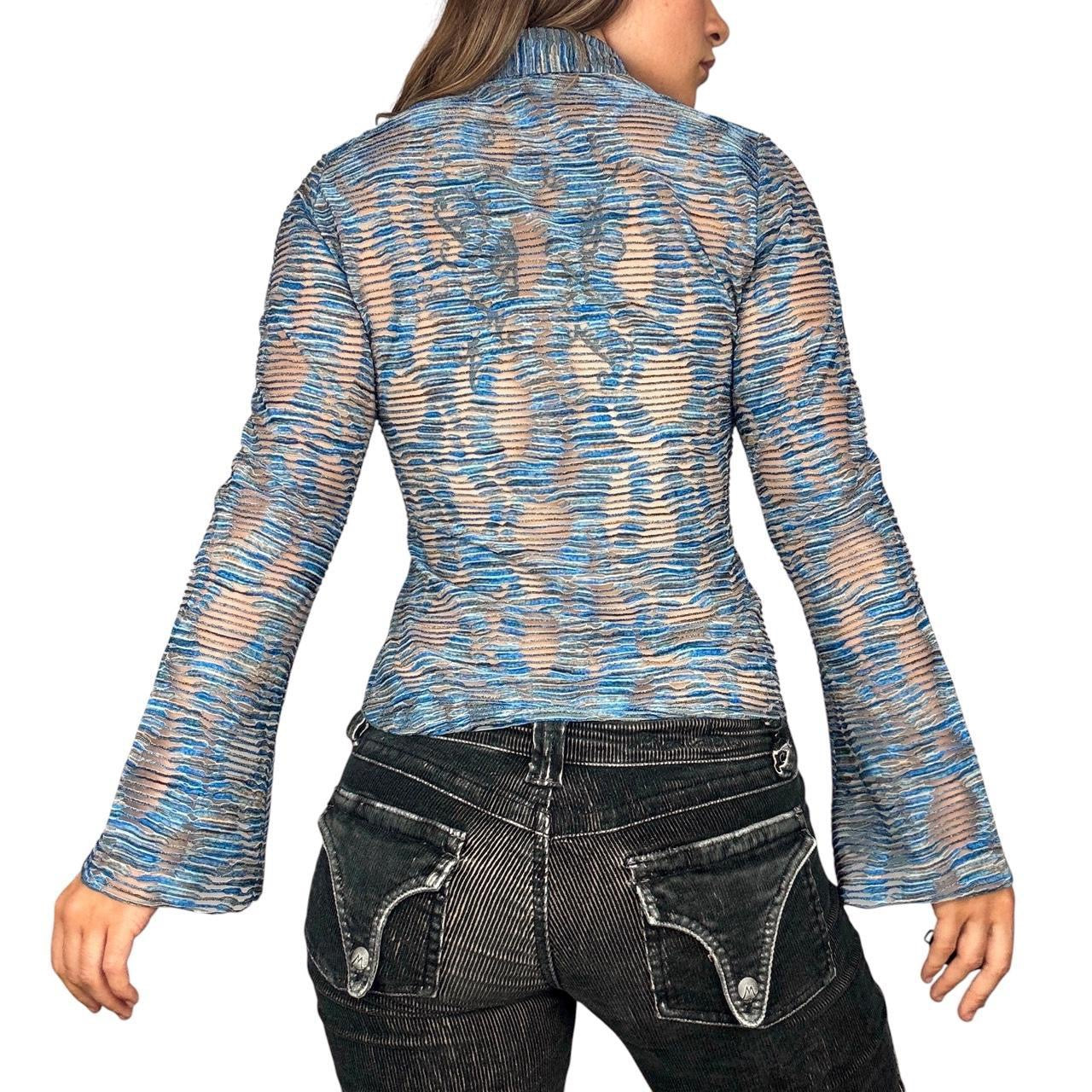 Blue mesh Bebe blouse from the 90s to early 2000s era. Sheer fabric with a unique texture. Slim fit with flared sleeves. Excellent condition.