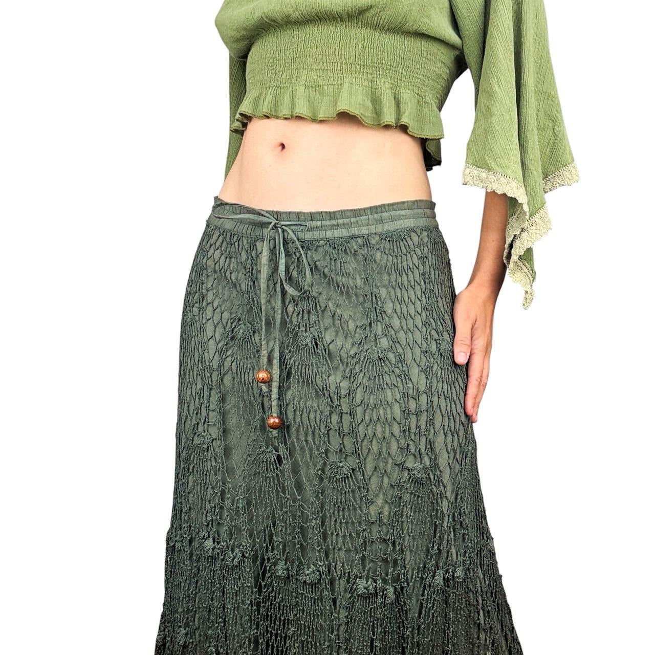 Earthy green maxi skirt from the early 2000s. Cotton fabric with a sheer crochet overlay. Adjustable drawstring waist. Great pre-loved condition.
