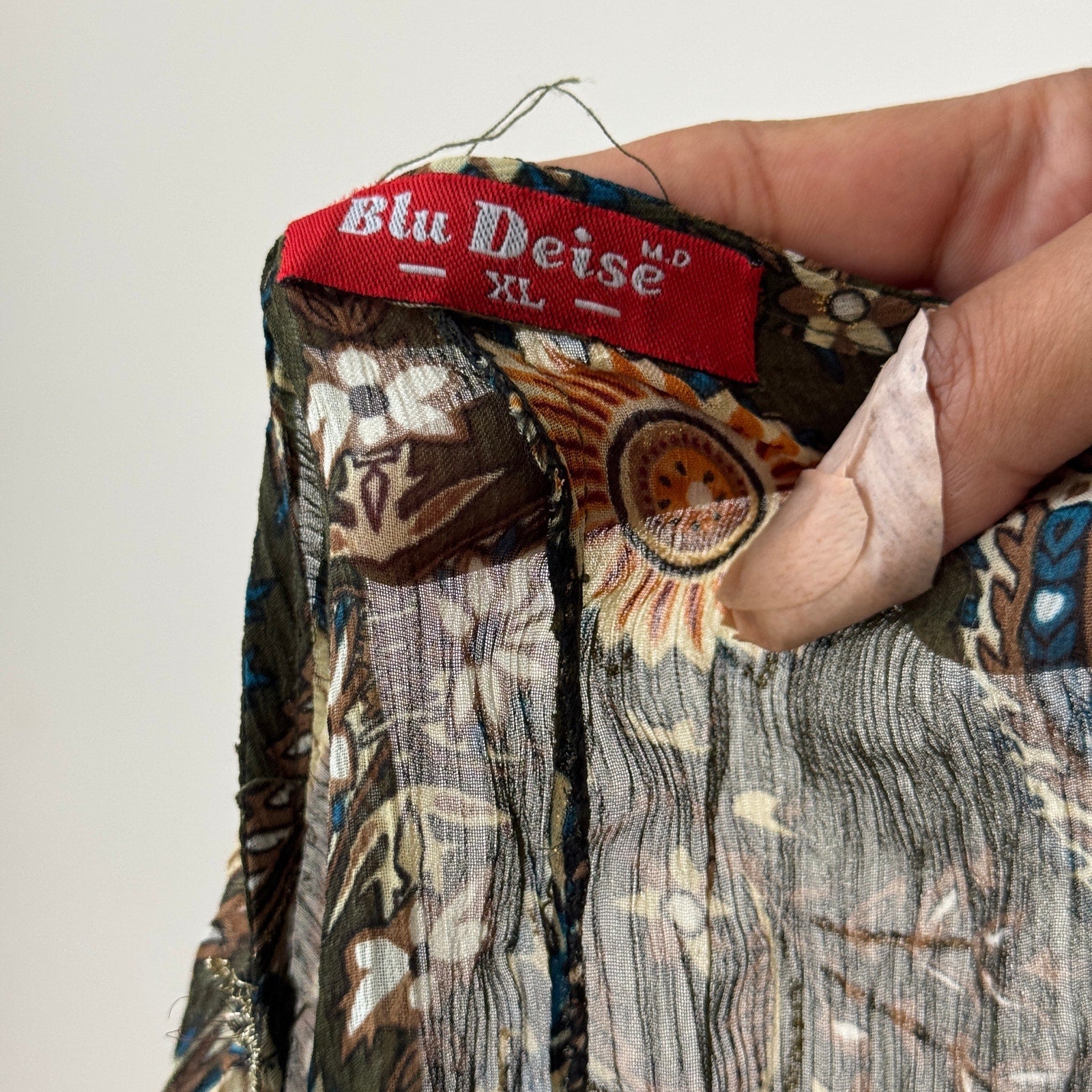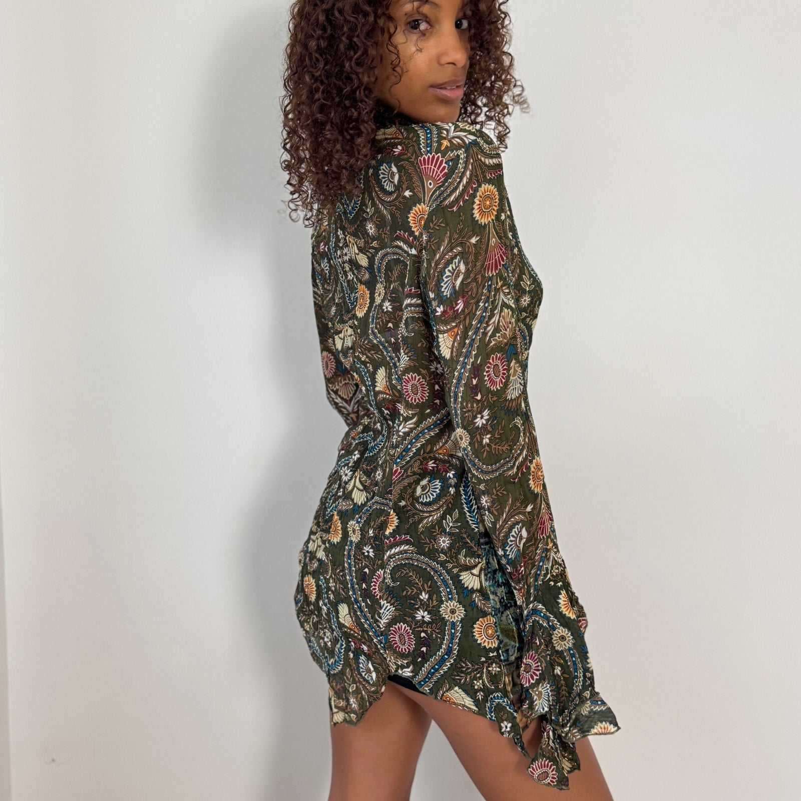 - Olive multi-print sheer mesh tunic with flared bell sleeves