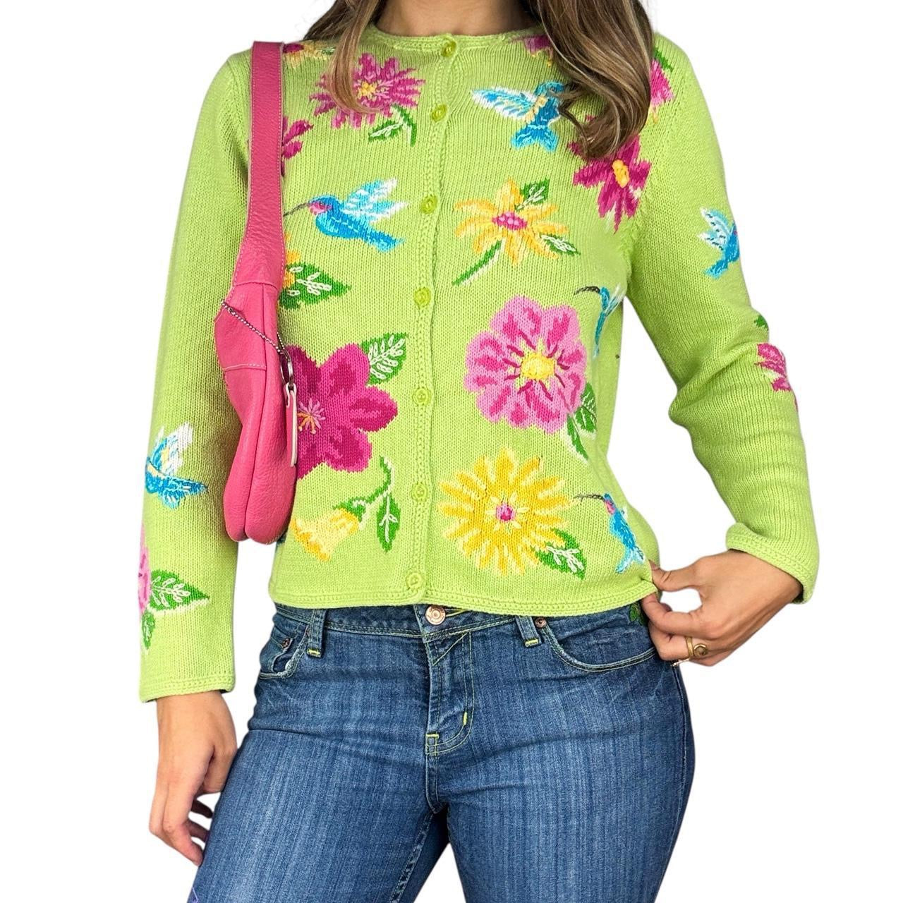 Pastel green button front sweater from the early 2000s. Dainty & whimsical piece with a floral hummingbird graphic. Soft, chunky ramie & cotton knit. No flaws.