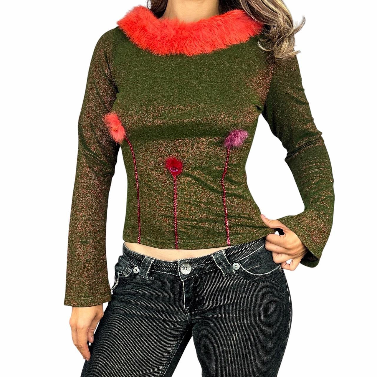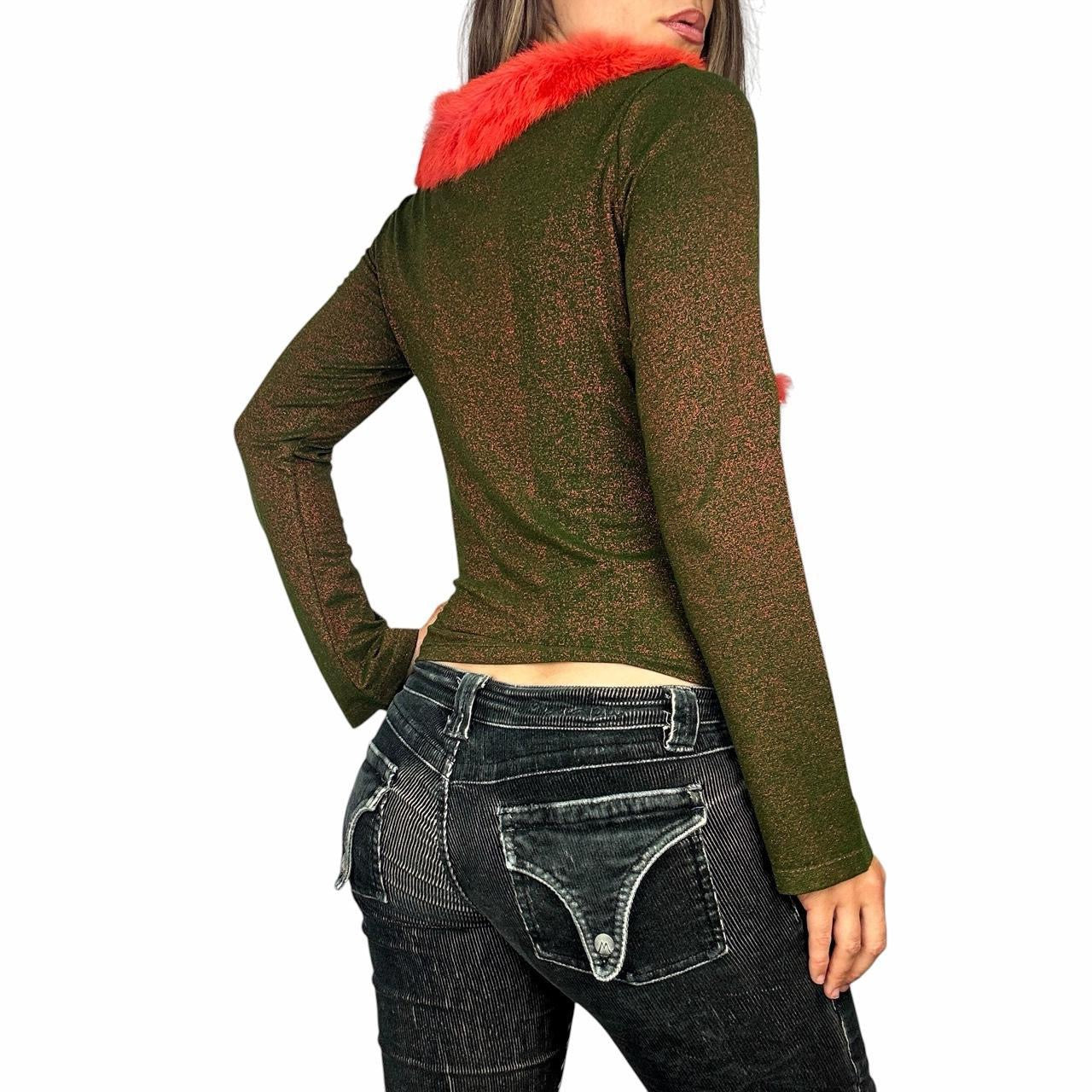 Unique & whimsical olive green blouse from the year 2000, featuring a vivid orange genuine fur neckline.