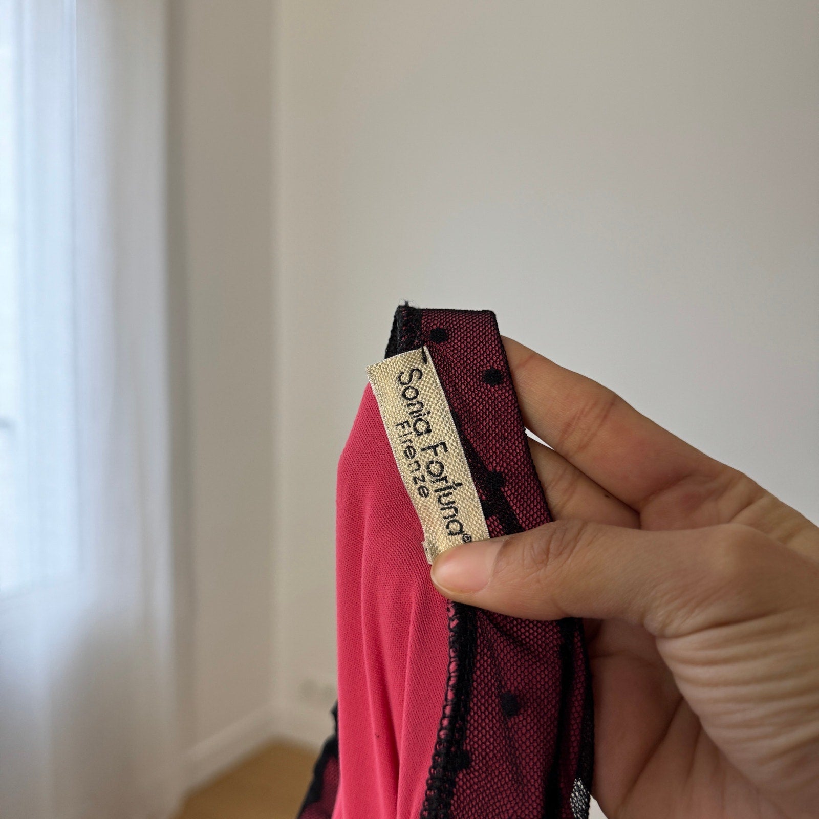 - Layered with a black sheer mesh overlay featuring a micro polka dot pattern