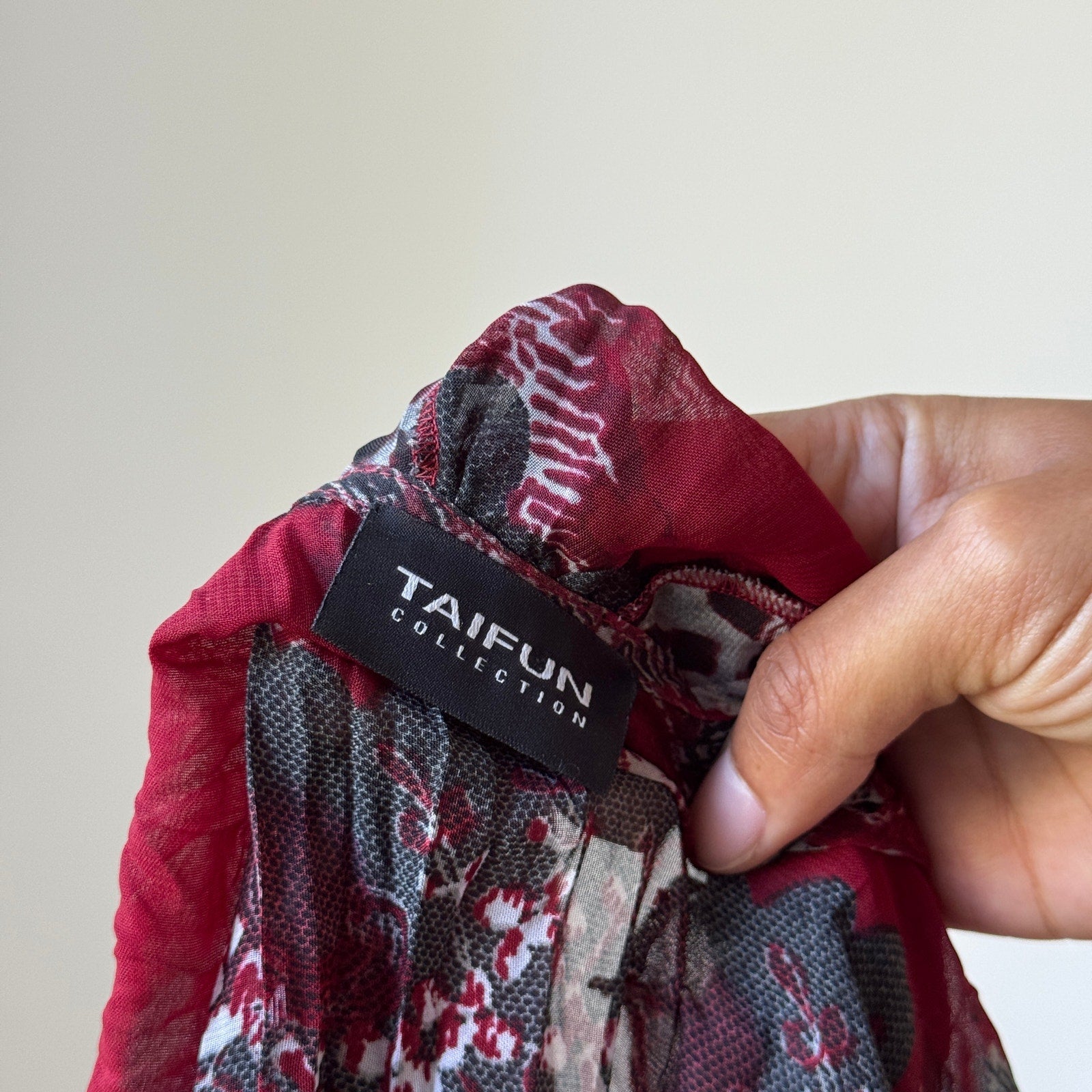 - Mesh ruffle jacket in layered red, black, and grey animal floral mix print