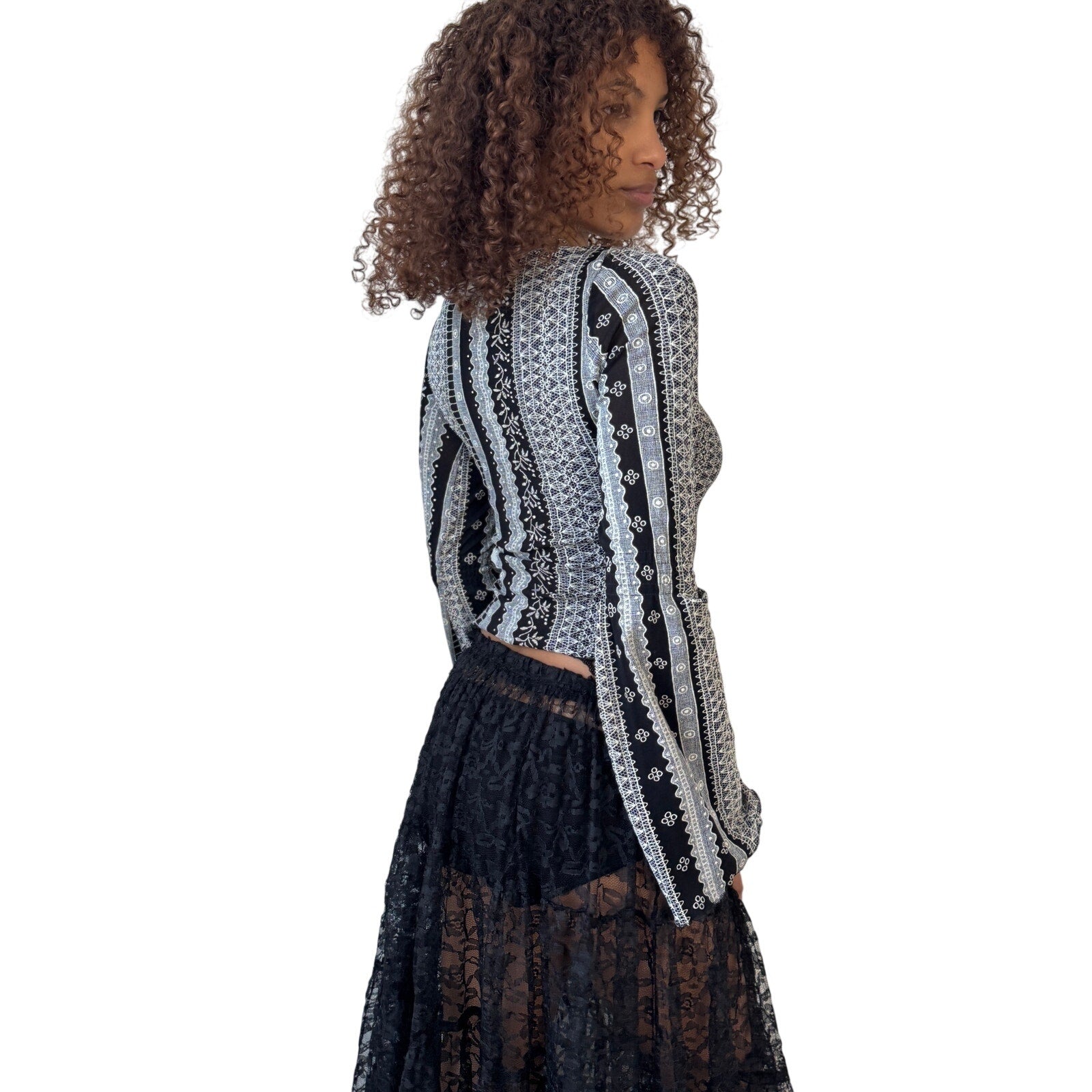 - Semi sheer mesh long sleeve top featuring an intricate
