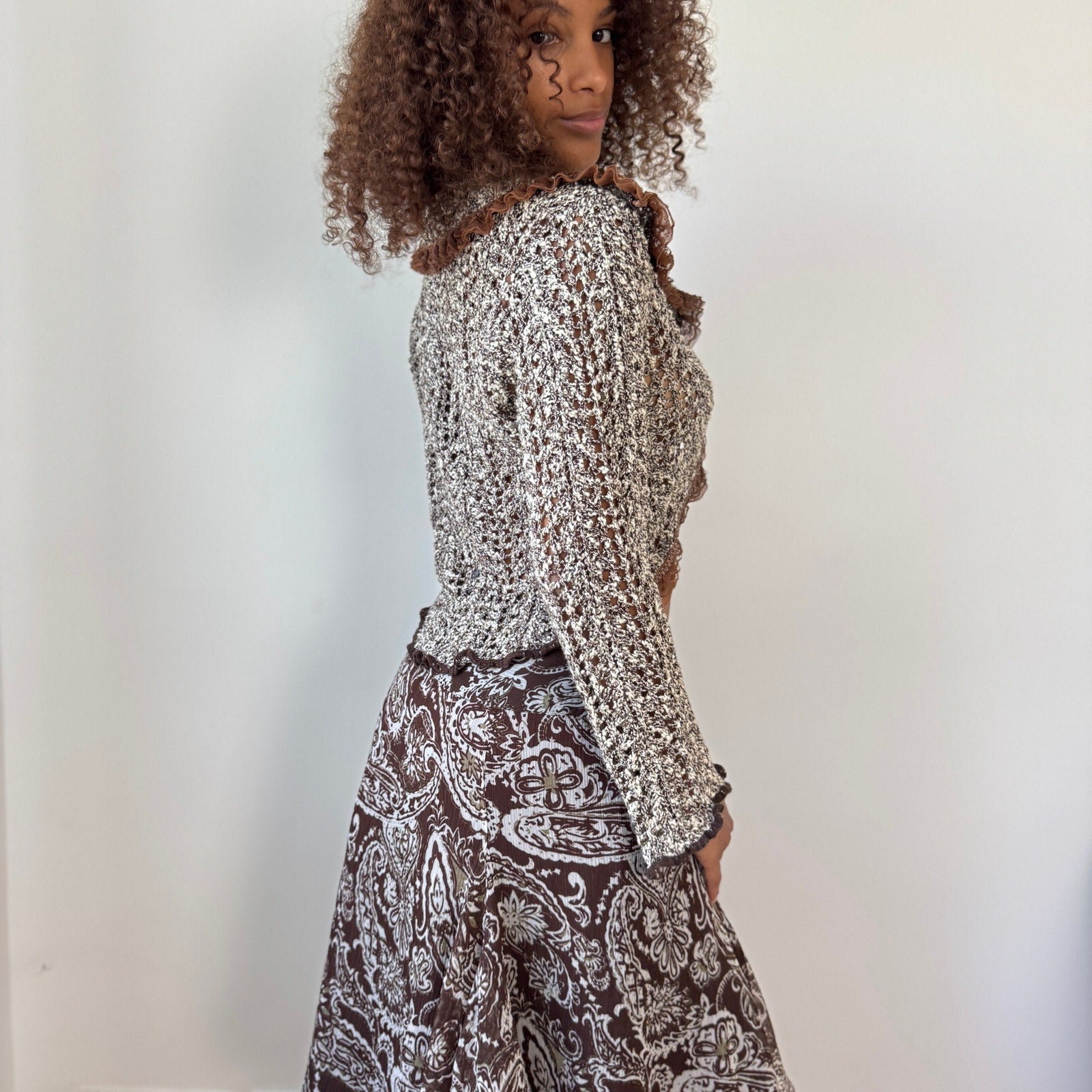 - Romantic ruffle-lace trim at the collar/edges and a tie-front closure