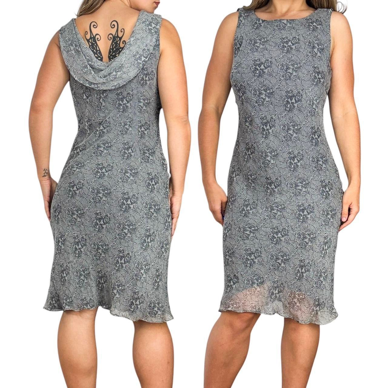 Elegant lacy rose patterned 100% silk chiffon dress from the 90s. High neck silhouette with a draped cowl back. Deadstock with original tags!