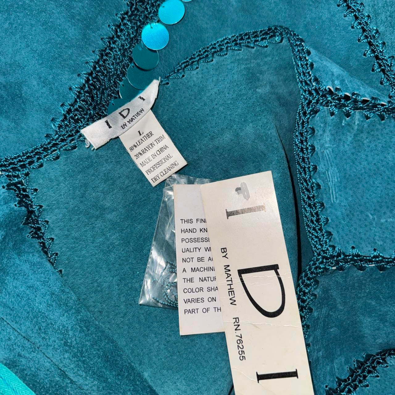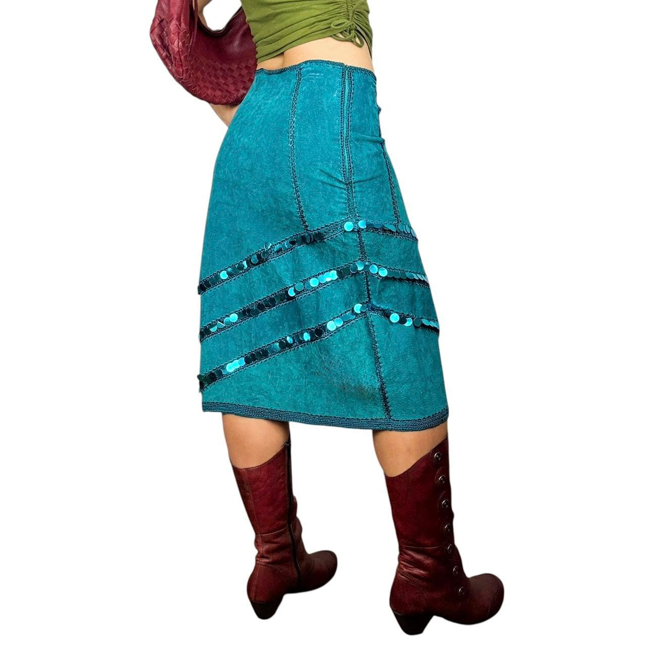 Gorgeous teal genuine leather suede skirt with crochet trim & sequin pailettes. Deadstock piece from the early 2000s; new with original tags.