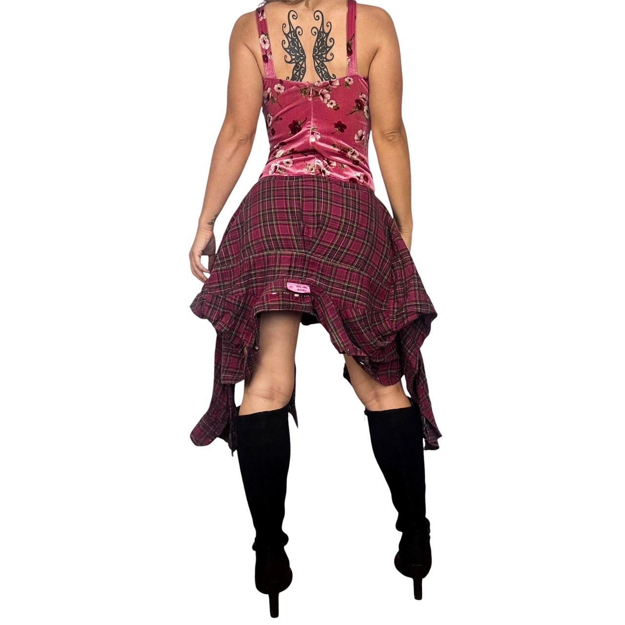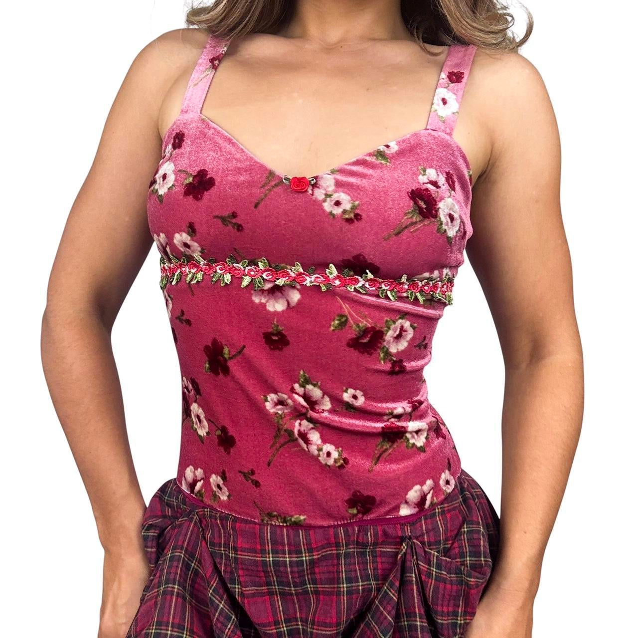 • Pink floral velvet bodice with a back zip closure, embroidered trim, & a dainty red rosebud