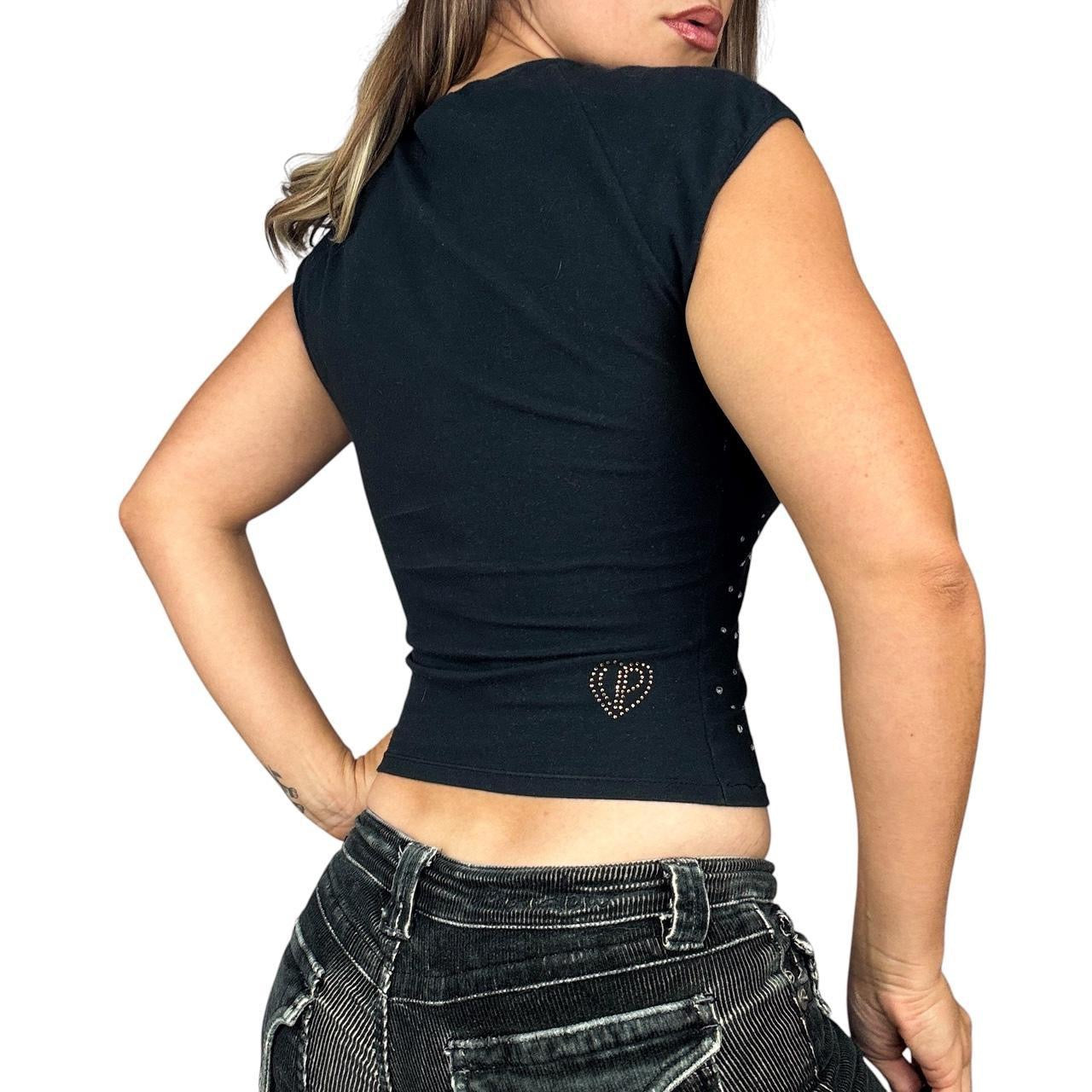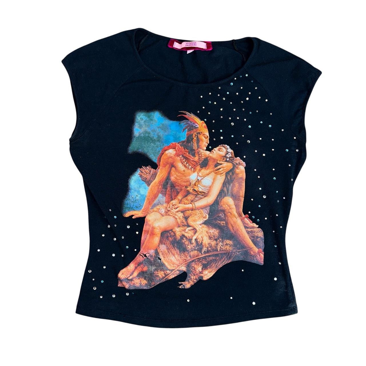 Italian designer baby tee from the early 2000s, made by Voyage Passion. Romantic tribal graphic featuring a woman with a deer snuggled up to a chieftain. Blue & white crystal embellishments that look like a starry night.