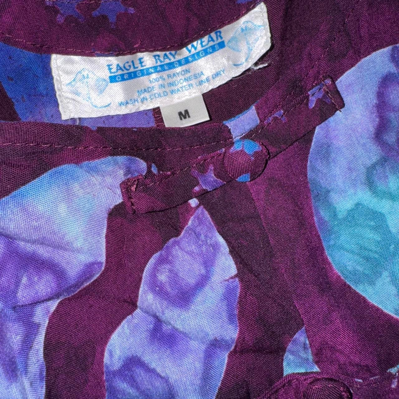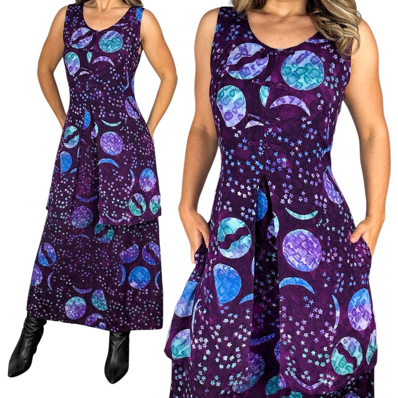 Whimsical boho maxi dress from the 90s, featuring a celestial tie dye print. Purple and blue comfortable cotton fabric. Flowy, layered silhouette with button detail & pockets. Excellent condition.