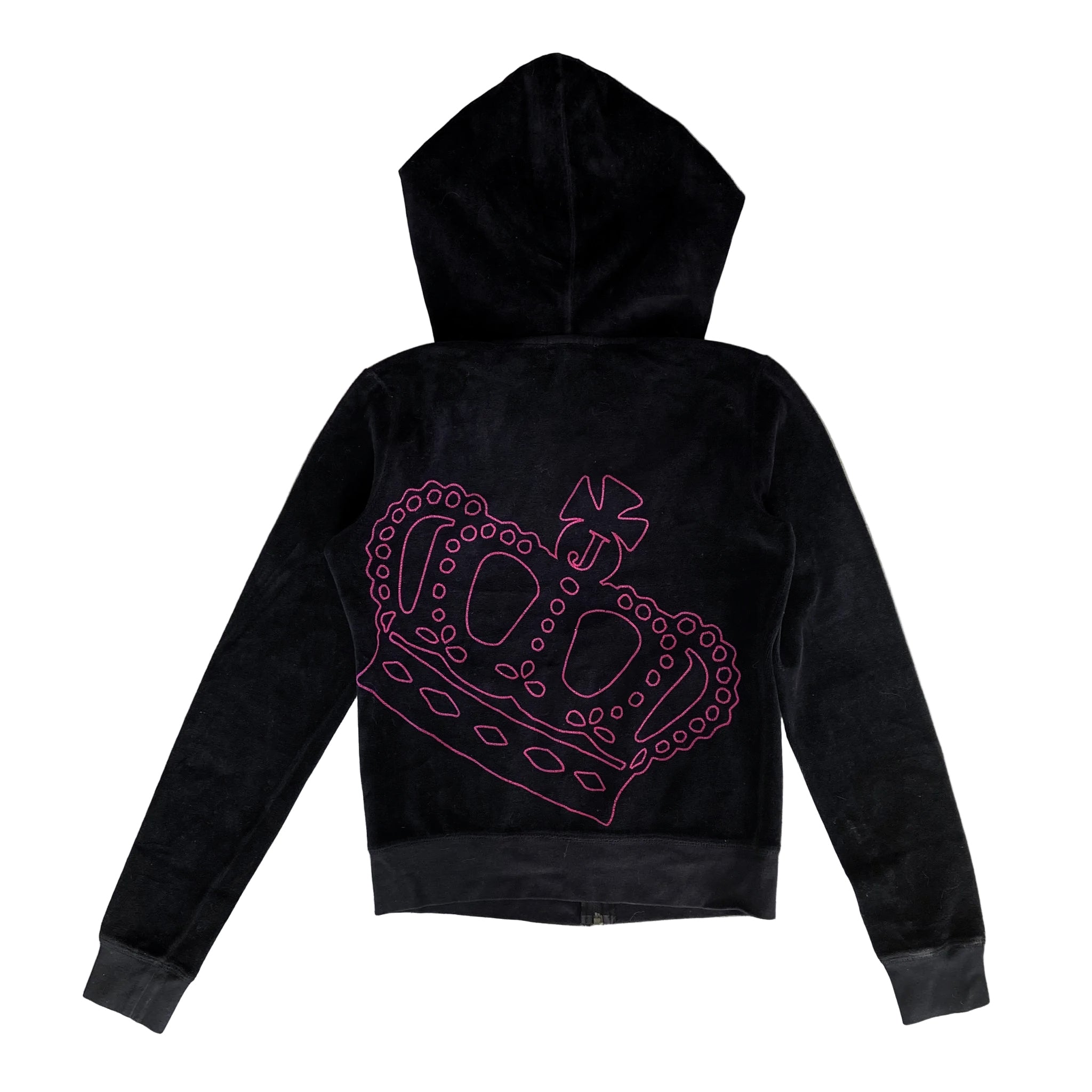 2000s Juicy Couture black velour set featuring the iconic “I ♥ Juicy” graphic at chest and hip. Classic zip hoodie with crown crest tag and matching low-rise drawstring pants. This is peak paparazzi era Juicy; paired with sunnies and flip phones.