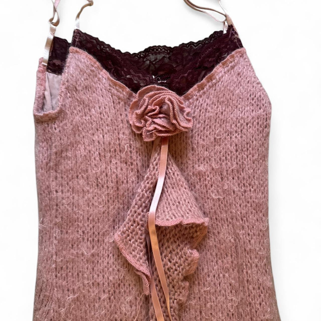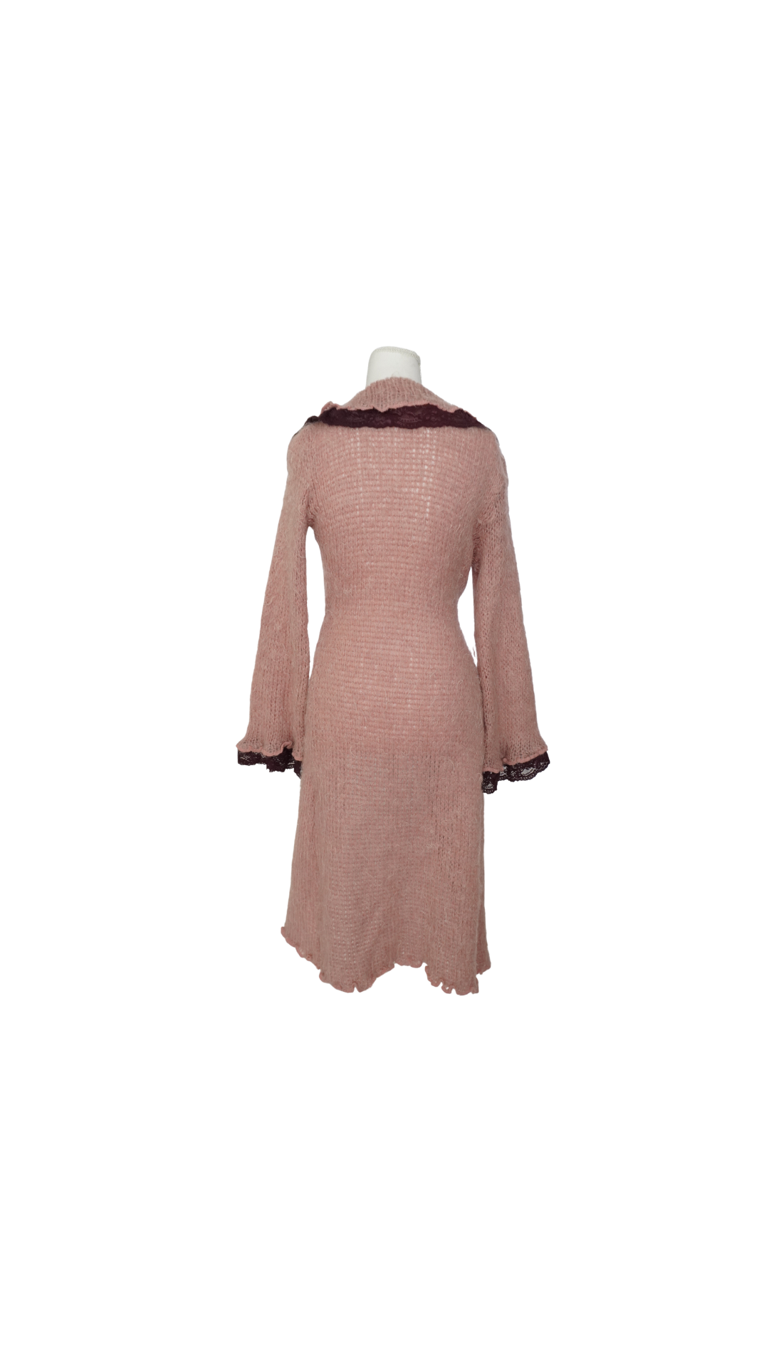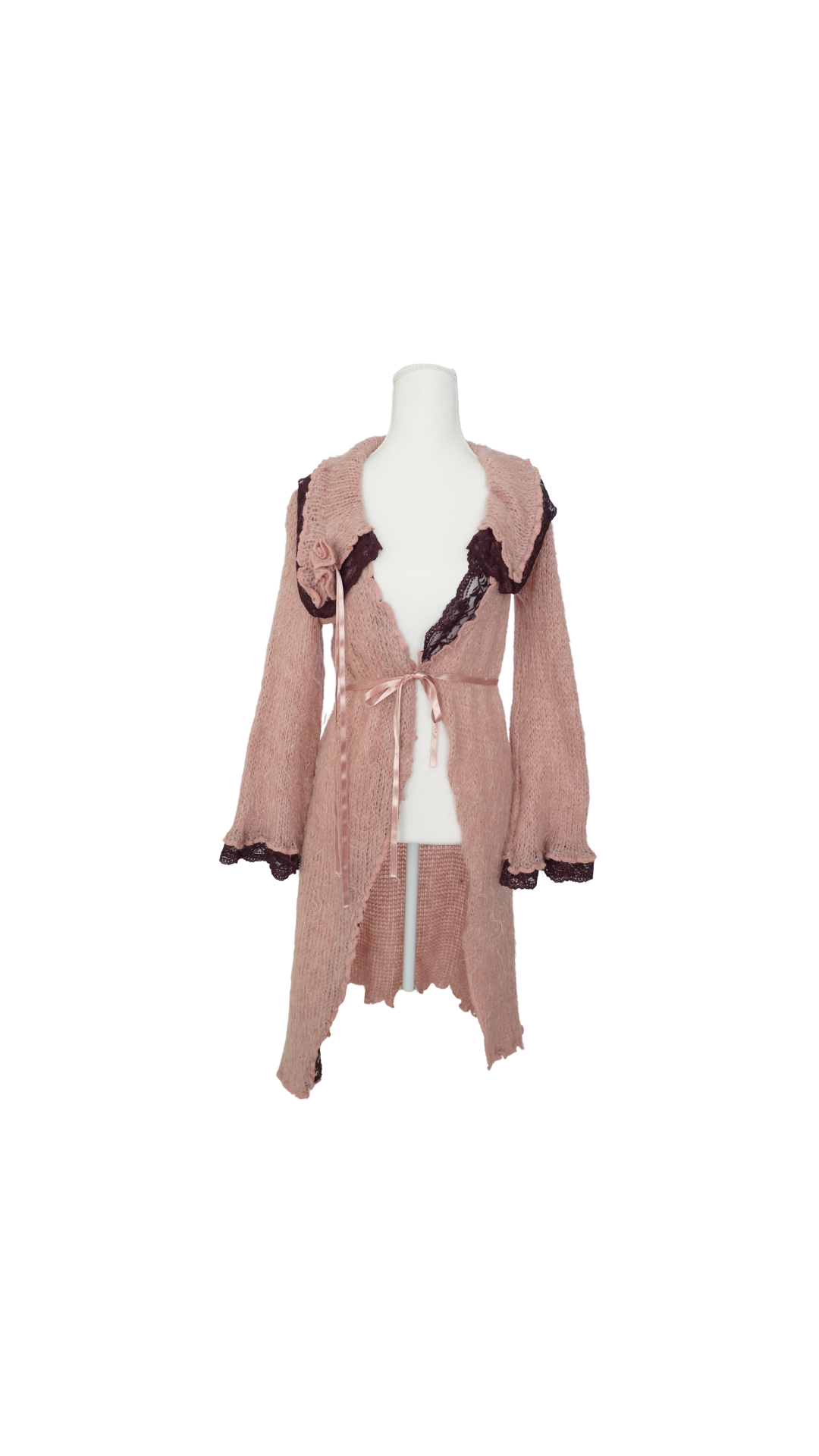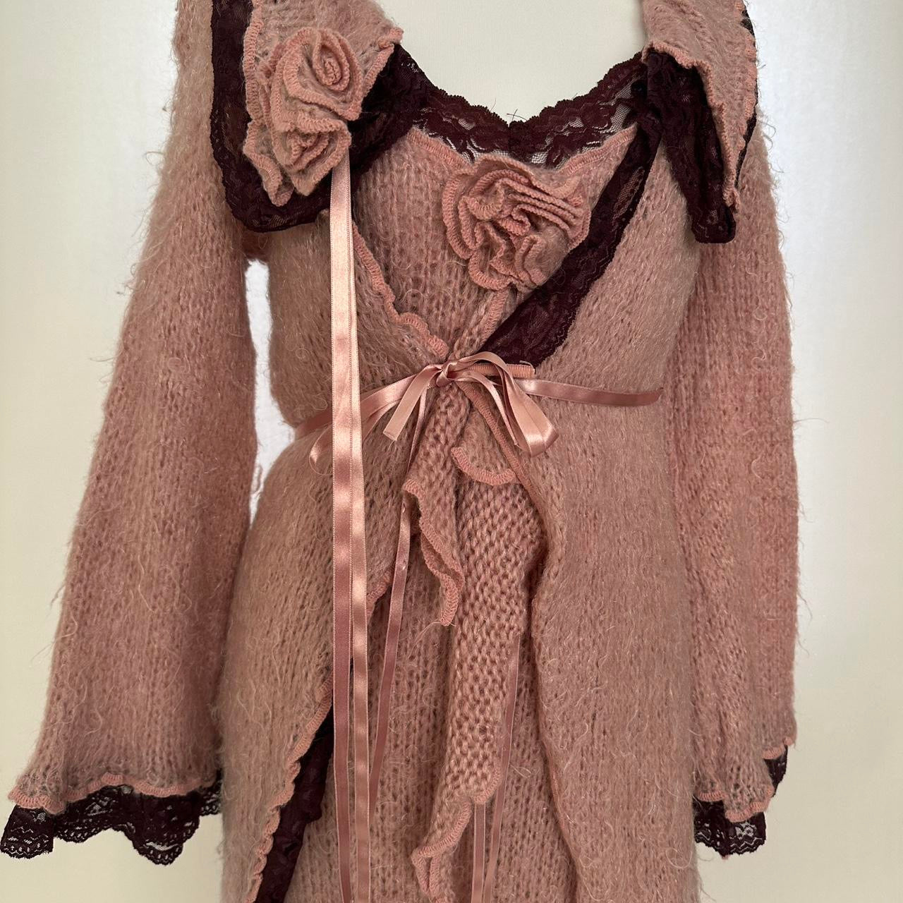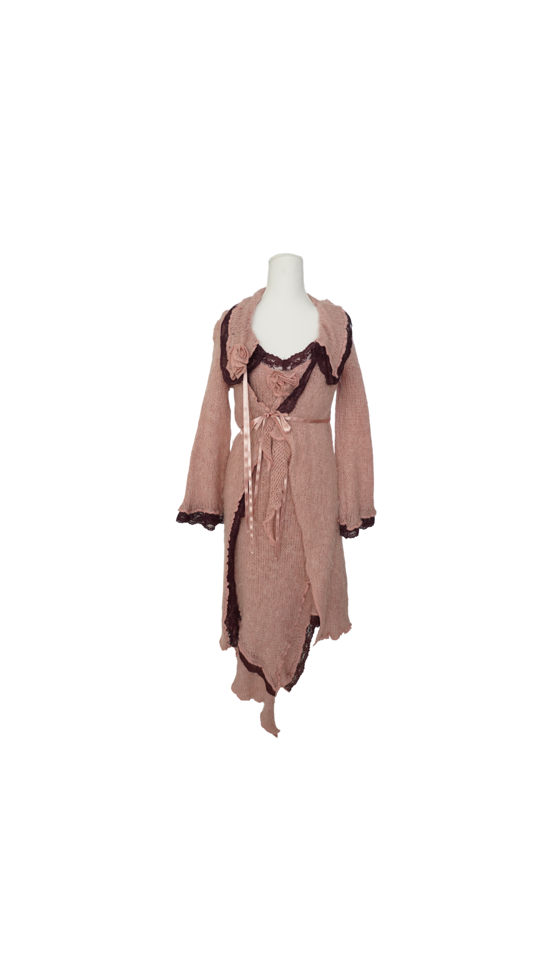 Insane Zone Bleue set. Consists of an asymmetric midi dress with lace details, a rosette and adjustable straps. Comes with a matching long cardigan with lace details and rosette. It closes with ribbons in the front.(Color is the most accurate on the last photo).